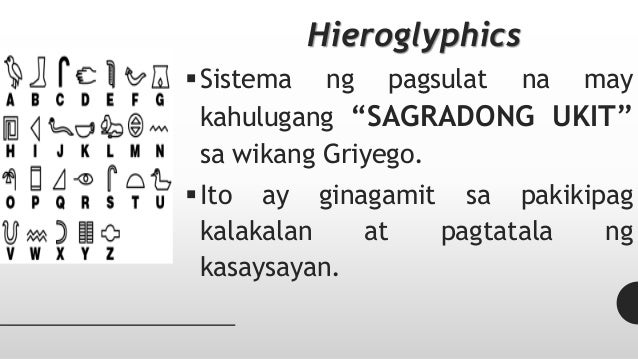 Ito ay ang tawag sa pormal na Sistema ng pagsulat ng mga naninirahan sa ehipto na nangangahulugang sagradong ukit sa wikang griyego. Nagsilbing mga bantayog ng kapangyarihan ng mga pharaoh at naging libingan ng mga. 1 question Ano ang sistema ng pagsusulat ng mga sinaunang Egyptian.