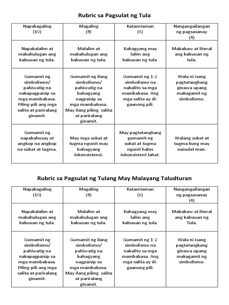 Description Download Rubrics Para Sa Pagsulat Ng Tula Comments. If you are author or own the copyright of this book please report to us by using this DMCA report form. PAGSULAT NG TULA Panuntunan.