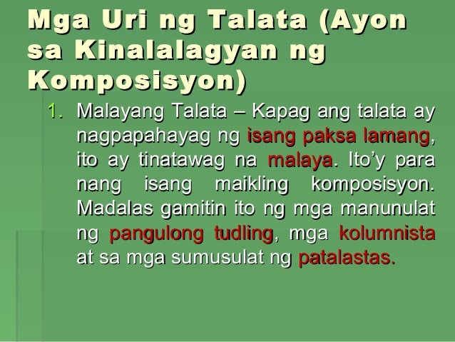 Talata pangungusapTalata pangungusap binubuobinubuo oo magkakaugnay na pangungusapmagkakaugnay na pangungusap nagpapahayagnagpapahayag kabuoankabuoan PagkukuroPagkukuro palagaypalagay paksang-diwapaksang-diwa. Samantala ang talatang naglalahad ay paraan ng pakikipagtalastasang pasulat o pasalita na naglalayong magpaliwanag. Ikinakailangan ng talata ang ilustrasyon na ang ibig sabihin ng ilustrasyon ay -ipinakikilala ang pagsuporta o paglilinaw sa pangunahing ideyailustrasyon ang gagalipting patunay.