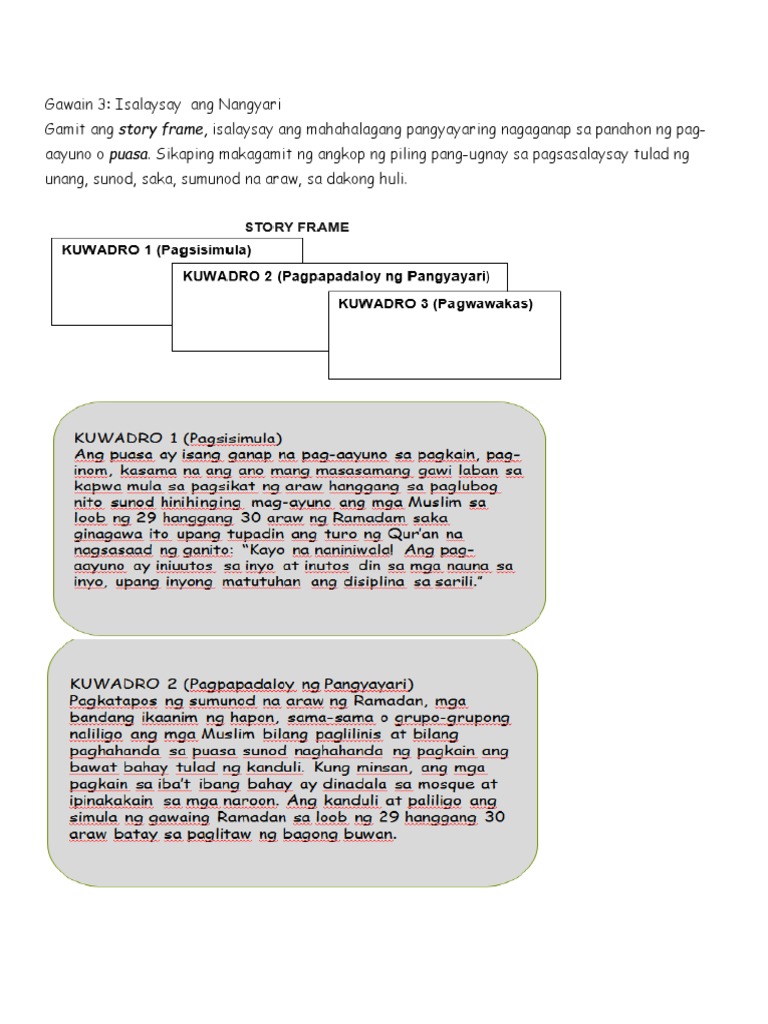 3 question B. PANGYAYARI SA PARABULA PANGYAYARI SA SARILING KARANASAN KUWADRO 1 PAGSISIMULA KUWADRO 2 PAGPAPADALOY NG PANGYAYARI KUWADRO 3 PAGWAWAKAS. Kuwadro1 PAGSISIMULA-Ang panimula ang ipinapakita dito kung ano ang ibig sabihin ng salitang Puasa.