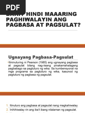Pagbasa at pagsulat tungo sa pananaliksik. Ang ugnayang pagbasa at pagsulat ay nag-iisang pinakamahalagang pagbabago sa pagtuturo ng wika - Pearson 1985 108 103. Ang-Ugnayan-ng-Pagbasa-at-Pagsulatpptx from CHEM 0331 at Rehman College of Rehabilitation Science Hayatabad Peshawar Dr of Physical Therpay 5 Years.
