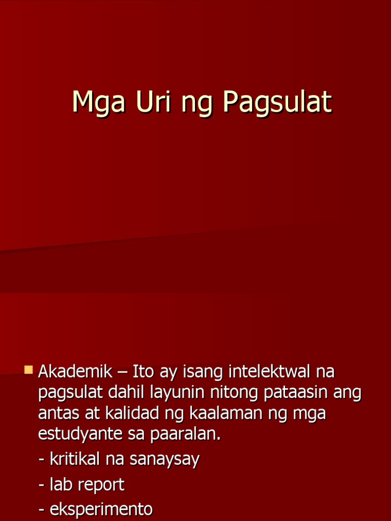 Ayon kay Peter Elbow nasa Brown 1994321 ang pagsulat ay pakikipag- ugnayan sa mga salita upang mapalaya ang sarili sa kung anuman ang kasalukuyang naiisip nararamdaman at nahihinuha. Uri ng pagsulat - Free download as Powerpoint Presentation ppt PDF File pdf Text File txt or view presentation slides online. Mahahalagang Bagay na Dapat Tandaan sa Panunuri II.